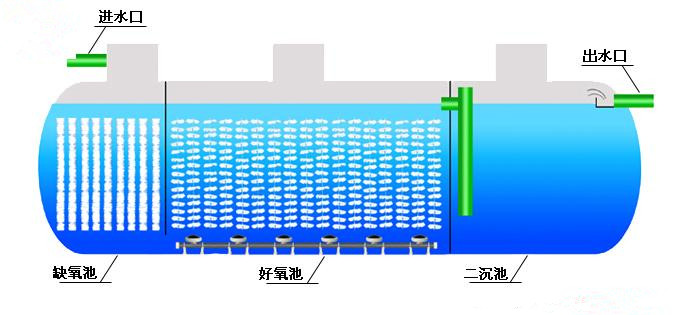 一體化污水處理設備是將一沉池、I、II級接觸氧化池、二沉池、污泥池集中一體的設備,并在I、II級接觸氧化池中進行鼓風曝氣,使接觸氧化法和活性污泥法有效的結(jié)合起來,節(jié)省了找人設計污水處理工藝和做基礎建設的繁瑣。